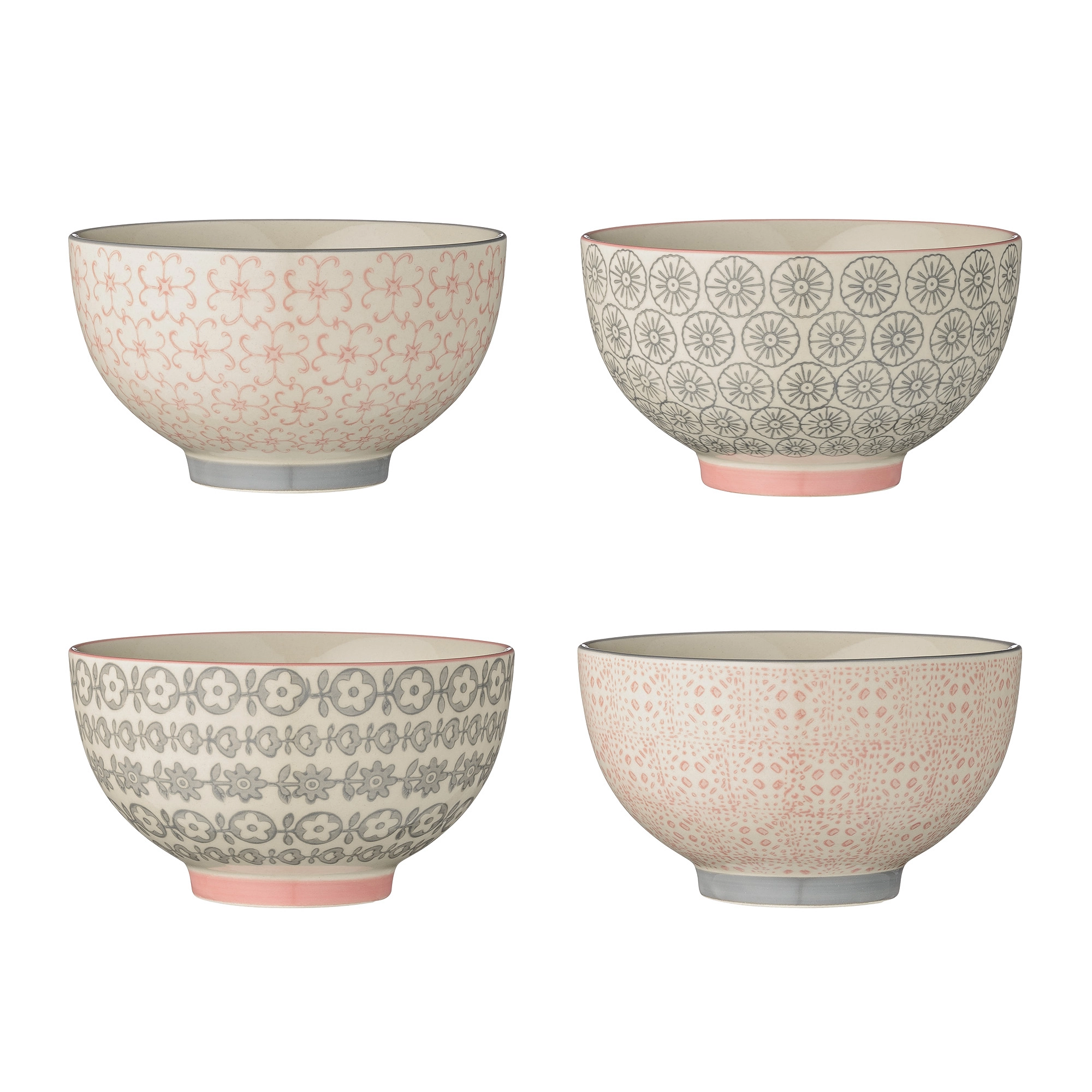 Anna elävyyttä kattauksellesi Bloomingvillen Cécile-kulhojen avulla! Kulhot toimitetaan neljän kulhon settinä ja ne on valmistettu lasitetusta kivitavarasta. Kussakin kulhossa on erilainen, harmaan ja vaaleanpunaisen sävyinen kuvio. Käytä kulhoja aamiaiselle, jälkiruoalle tai tarjoiluun ja yhdistä niihin myös muita Cécile-sarjan osia.